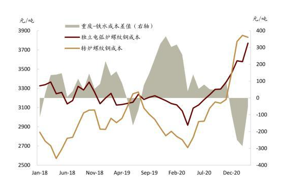 圖表: 在重廢-鐵水差大于100元的情況下,獨(dú)立電弧爐與轉(zhuǎn)爐螺紋鋼的成本才會出現(xiàn)逆轉(zhuǎn)