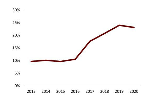 目前減少碳排放強(qiáng)度最好的選擇是加入廢鋼以替代鐵水,減少對鐵礦石的消耗。而鐵礦石燒結(jié)與高爐煉鐵流程則是鋼鐵產(chǎn)業(yè)鏈里里碳排放強(qiáng)度最高的兩個流程。中國的廢鋼比(廢鋼消耗占粗鋼生產(chǎn)量)最近幾年增長很快。得益于清除地條鋼釋放大量廢鋼資源和煉鐵產(chǎn)能增長落后于鋼鐵需求增長,廢鋼比從2016年的10%迅速提升到去年的24%,但仍落后于美國(70%,2019年數(shù)據(jù),下同),韓國(40%)與日本(35%)。